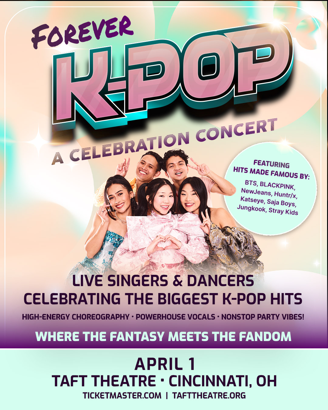 Right Angle Entertainment and Maple Tree Entertainment today announced the ultimate K-Pop fan night out with a brand-new concert experience set to burst onto stages around North America this spring, including a stop at Cincinnati’s Taft Theatre for one show only on April 1. Inspired by the worldwide K-Pop phenomenon and recent smash-hit film KPop Demon Hunters, Forever K-Pop – A Celebration Concert (www.ForeverKpopLive.com) brings a next-level, fan-powered tribute experience and high-octane production featuring today’s biggest K-Pop hits to life on stage in a cinematic spectacle unlike anything audiences have seen in a tribute concert before. With BTS returning to the global stage, the K-pop genre will see renewed momentum, drawing increased attention from longtime fans and new audiences worldwide.